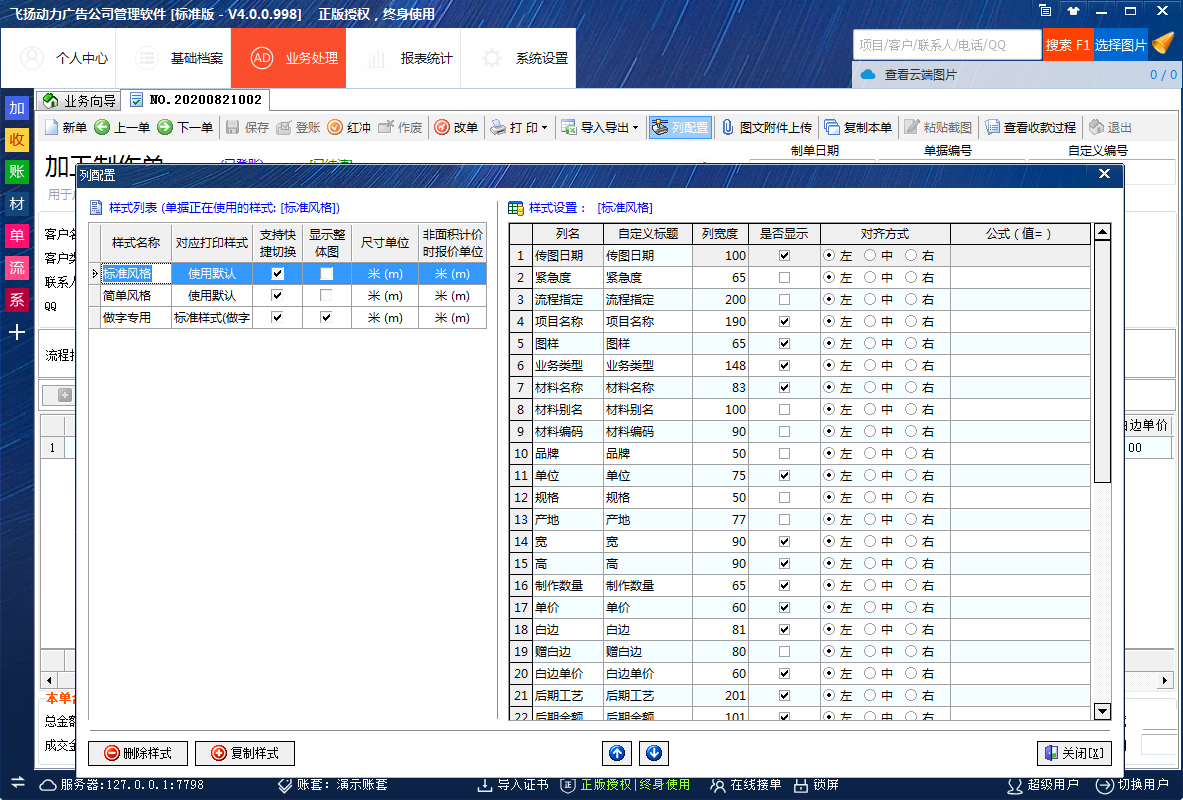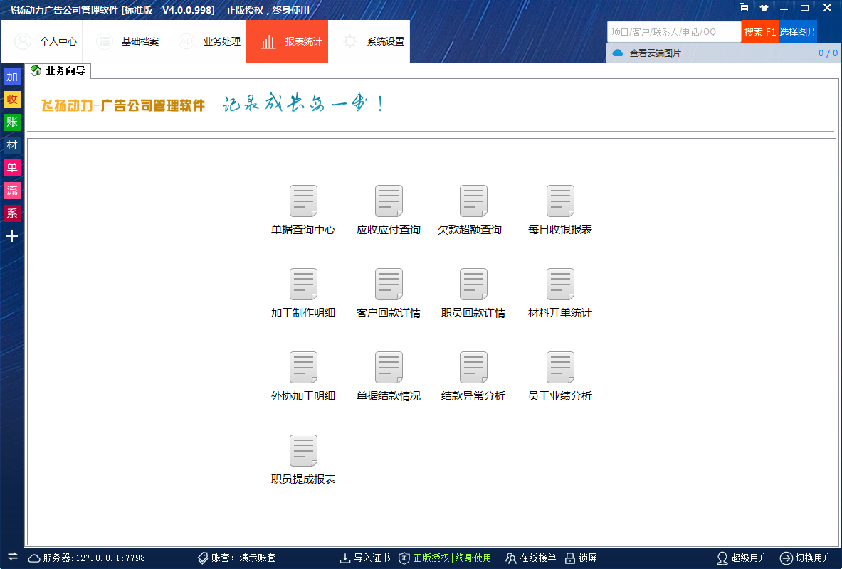 飛揚動力廣告公司管理軟件標準版適合中型廣告制作企業(yè),集業(yè)務(wù)開單、外協(xié)加工管理、業(yè)務(wù)流程管理、客戶管理、材料管理、往來策略(不同的客戶不同的價格)、業(yè)務(wù)單打印等多項功能為一體,是企業(yè)數(shù)字化轉(zhuǎn)型首選。