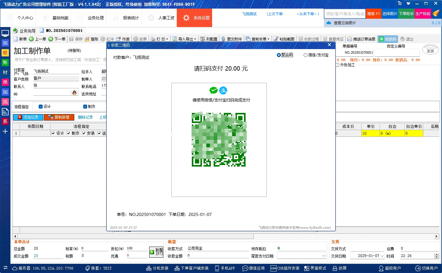 飛揚動力最新版4.1.0.455開通了聚合支付功能,開通后是一單一碼,客戶掃碼付款后,單據(jù)自動登賬,收款不再是難題,有需要的客戶可聯(lián)系我們開通
